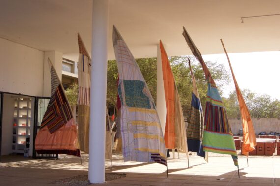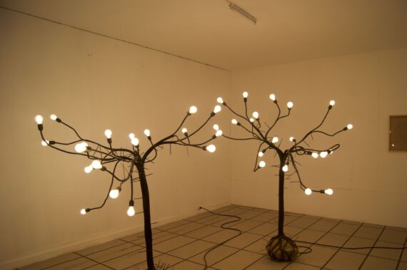 Unassuming sculptures by France based Mozambican artist Téo Betin are characterized by a close attention to detail while bringing together diverse elements of a complete narrative. A staircase he constructed vividly establishes links with nearby objects. Moroccan artist Mohssin Harraaki installed a series of rocks that have been tired with black cables in the form of trees that end up as light bulbs. The installation, which expresses a diversity of ideas, is equally linked to genealogy, inheritance and history.