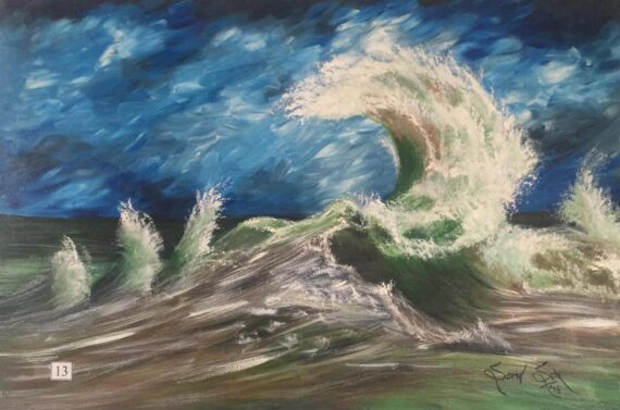 Broad-brush strokes that end up as stylized human figures inundate her backgrounds and cloud formations. She wittingly allows a pronounced amount of light in some works thereby allowing them to sparkle.