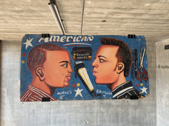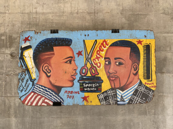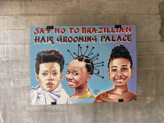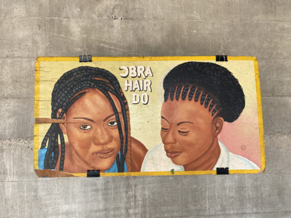 Often painted in glowing commercial paint on plywood, hair cut / hair dressing salon sign boards on display are repetitively colorful and amusing while reflecting traditional and contemporary haircuts and braiding.