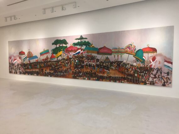 Titled “The First Day of the Yam Custom 1818”, the paintings, which are based on an image by the British adventurer, author and zoologist Thomas Edward Bowdich, explore and expose the contractions that surround such images that were circulated largely in Europe.