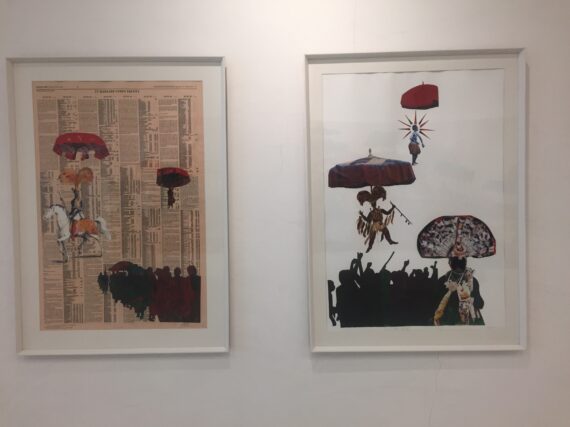 In a large-scale work, Donkor vividly depicts the late King Osei Bonsu (1804 – 1824) in the midst of a procession. The items he wears have been chosen to symbolize his fearless leadership and to indicate his role as the guardian of his people alongside flags that represent European countries that trade with the Asante Kingdom.
