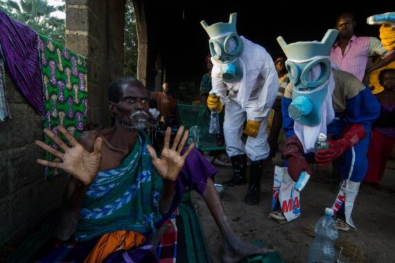 Images of health workers clad in biohazard suits by Emmanuel Bakary Daou (Mali) recall horrifying memories of the Ebola virus that wrecked havoc early this year in Guinea, Liberia and Sierra Leone. The suit, which shields the identity of health workers, equally recalls the activities of undercover reporters who appear at public enquiries completely hooded.