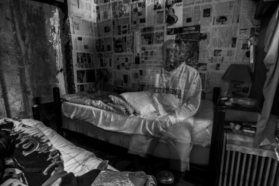 Black and white photos by Nassim Rouchiche from Algeria depict the perilous living conditions of a community of migrants from Sub Saharan Africa in the Algerian capital Algiers. His apparition-like images effectively blend with nondescript walls that tend to place the viewer in the situation of the migrants.