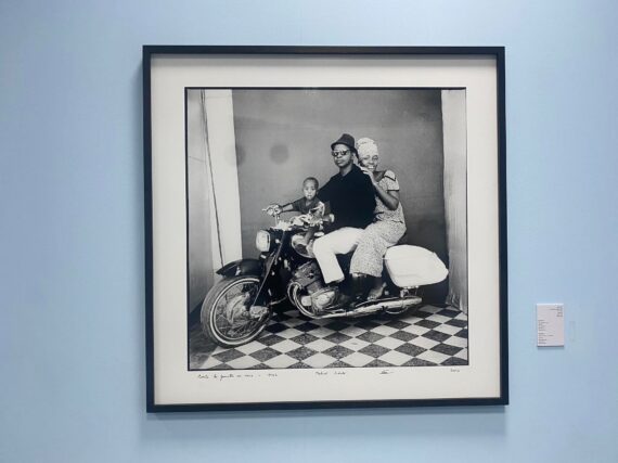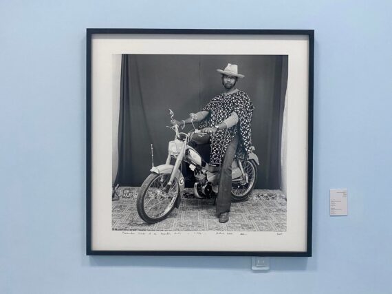 Sidibé, who died in 2016 set his attention on studio portraits alongside a background of the fabrics in vogue during the period while marshaling a black-and-white linoleum carpet on which he took pictures with diverseprops including motorcycles, record players, cars and television sets.