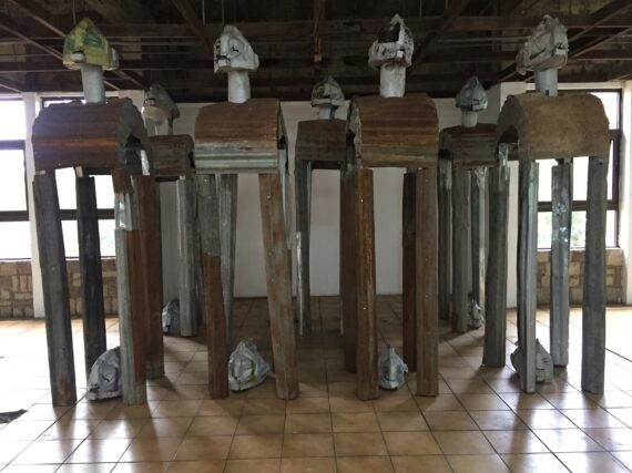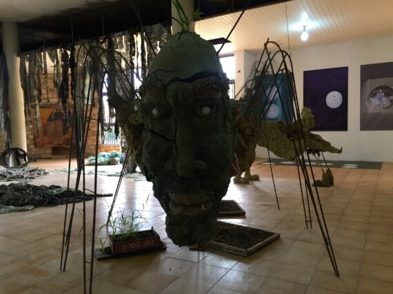 Larry Akuma invites us to childhood enchantments and fantasies with an interpretation of Akan mythical characters including the famous / infamous Kweku Ananse, which was realized in clay, iron rods and chicken wires. He allows grasses and weeds to germinate from cracks and boxes nearby while folk music engulfs the area around the piece.