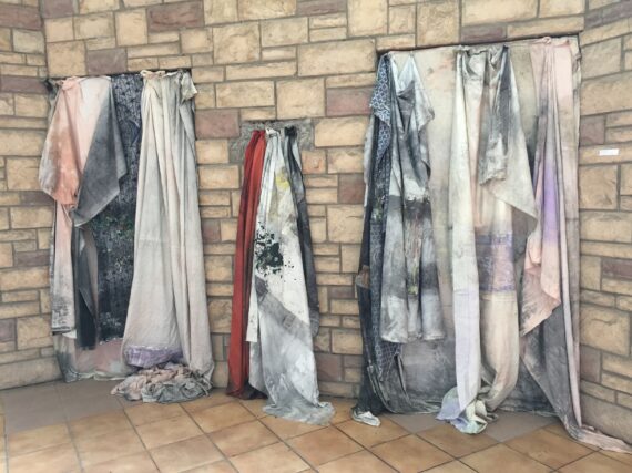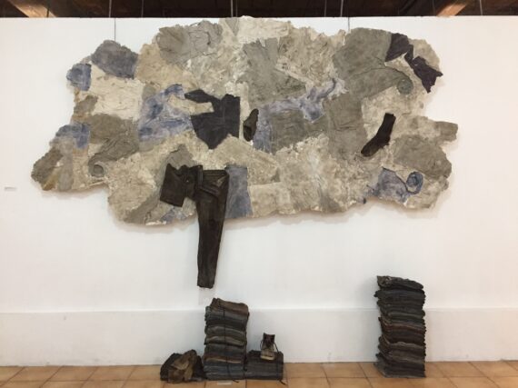 The fight against galamsey (illegal mining) and its attendant health issues is taken on by Praises Adu Benhene, who showcased decommissioned costumes of galamsey miners, which have been preserved in their natural state with accumulation of dirt, oils, sweat, dust, fungi among others.