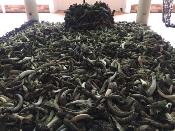 Grotesque installations of severed cattle horns – which are strung together, dry and fast decaying – comment on the excruciating journeys faced by cattle when transported from Northern Ghana as well as brutal forms of slaughtering, a practice, which is widespread in the country.