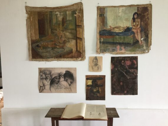 Paintings of nude and semi nude women by veteran painter Kofi Dawson show influences from his time at the Slade School of Art (UK) while reminding viewers of Ghanaian art in the 1960s. His works generally show him as a remarkable designer with a flamboyant post-impressionist aesthetic.