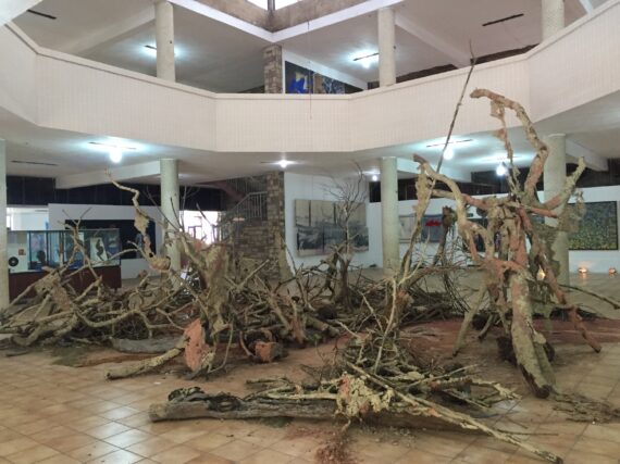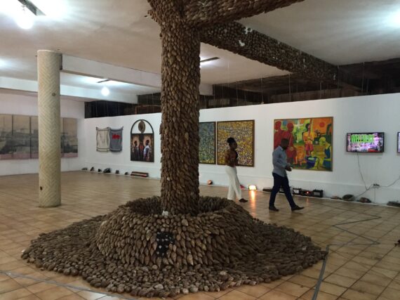 Livingstone Amoako reminds us of the sharp depletion of forest reserves in the country by stitching snail shells on columns and floor of the museum. The piece is nostalgic as it recalls how snails abound during the rainy season in his village as a young boy.