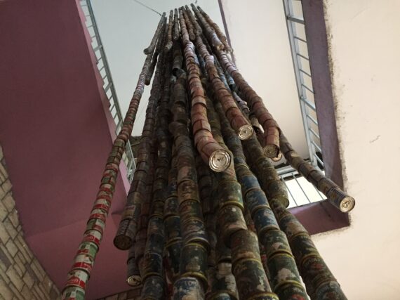 Large-scale installations from non-descript discarded processed food cans by Kwame Asante Agyare turn into a huge “water fall” as it dangles from the roof of the museum. The piece, which is found elsewhere in the museum, criticizes the excesses of consumerism.