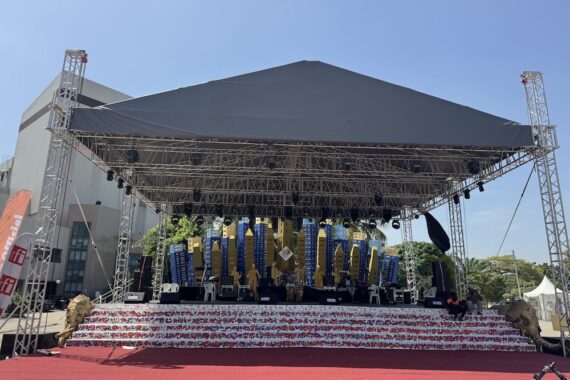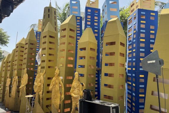 This vertical dominance anchors the composition, creating a focal point that draws the audience’s gaze. On either side of the stage, mirrored replicas of the iconic ADO Bridge extend the urban metaphor, paying homage to one of Côte d’Ivoire’s most recognizable infrastructural landmarks.